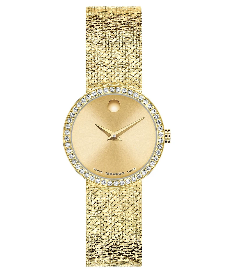 From Movado, this women's watch features: Gold-tone stainless steel mesh bracelet and case Lab grown diamonds Sunray dial Sliding buckle closure Quartz analog movement Case approx. 25mm Case thickness approx. 6.4mm Water resistance 3 ATM Swiss made Imported.