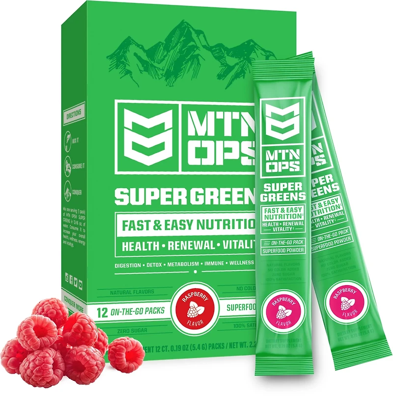 Reach for the MTN OPS SUPER GREENS Raspberry Sticks 12-Pack and enhance your drinks. These stick packs feature organic greens to boost metabolism, strengthen the immune system, give you energy and more. The raspberry flavor helps provide a great taste.