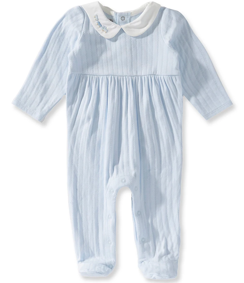 From Mud Pie, this sleeper features: Embroidered poplin collar Long sleeves Pointelle footed sleeper Inner leg snaps Cotton/polyester Machine wash/tumble dry low Imported.