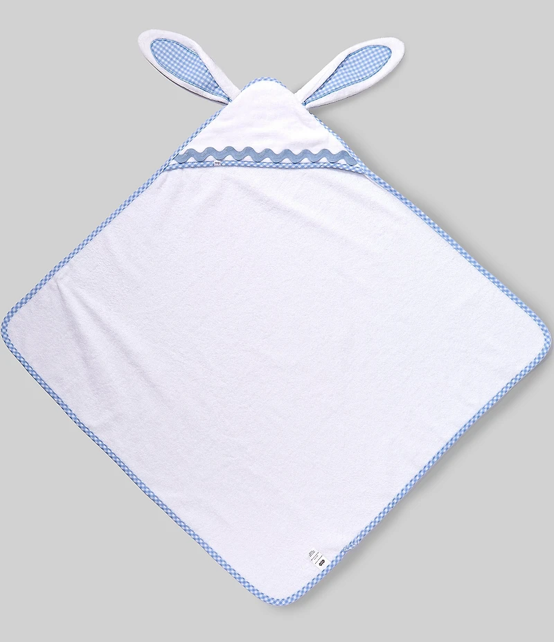 From Mud Pie, this towel feature: Bunny Hooded Towel Velour terry cloth with gingham trim Bunny ear hood with ric-rac detail 42" x 42", Cotton Machine wash/tumble dry Imported.