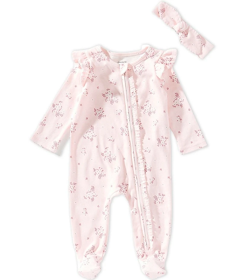 From Mud Pie, this 2-piece set features: Graphic pink blossom print Crewneck Long sleeve Pink Zipper closure Interlock footed sleeper with ruffle details Comes with bow headband Cotton Machine wash/tumble dry Imported