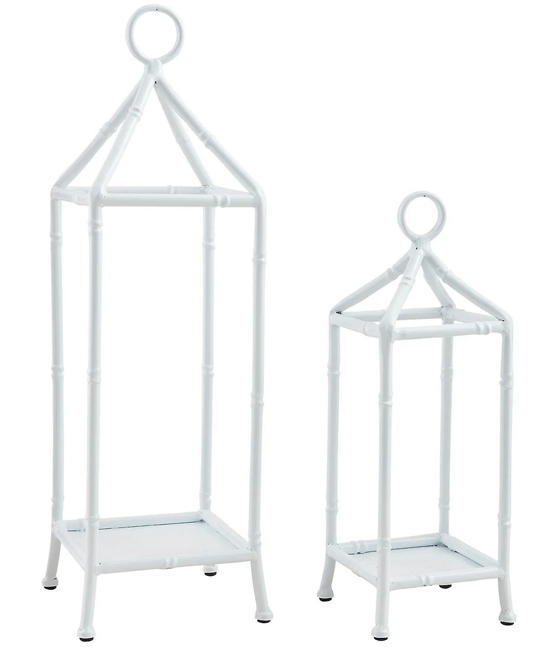 From Mud Pie, the Bamboo Metal Lantern, Set of 2 features: This elegant set includes two cast aluminum lanterns designed in a sophisticated bamboo style Perfect for adding a touch of modern charm to any space Each lantern is coated with a durable enamel finish, ensuring longevity and a sleek appearance Candle not include Allowing for versatile placement and styling options Ideal for both indoor and outdoor use, these lanterns provide a warm, inviting glow when lit, enhancing the ambiance of any setting For decorative use only The set features two sizes: Small lantern approx. 15.5" H x 4" L x 4" W Large lantern approx. 20.5" H x 5.5" L x 5.5" W Imported.