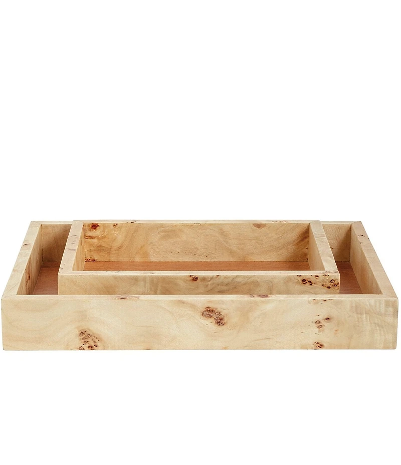 From Mud pie, this nested wood trays features: Burl Wood Trays offer a stunning blend of natural elegance and functionality, perfect for enhancing any home decor. Nested set of two trays Mango wood Burl wood edges Hand wash only Each Measures Approx. small 8" x 12" Approx. large 12" x 18" Imported