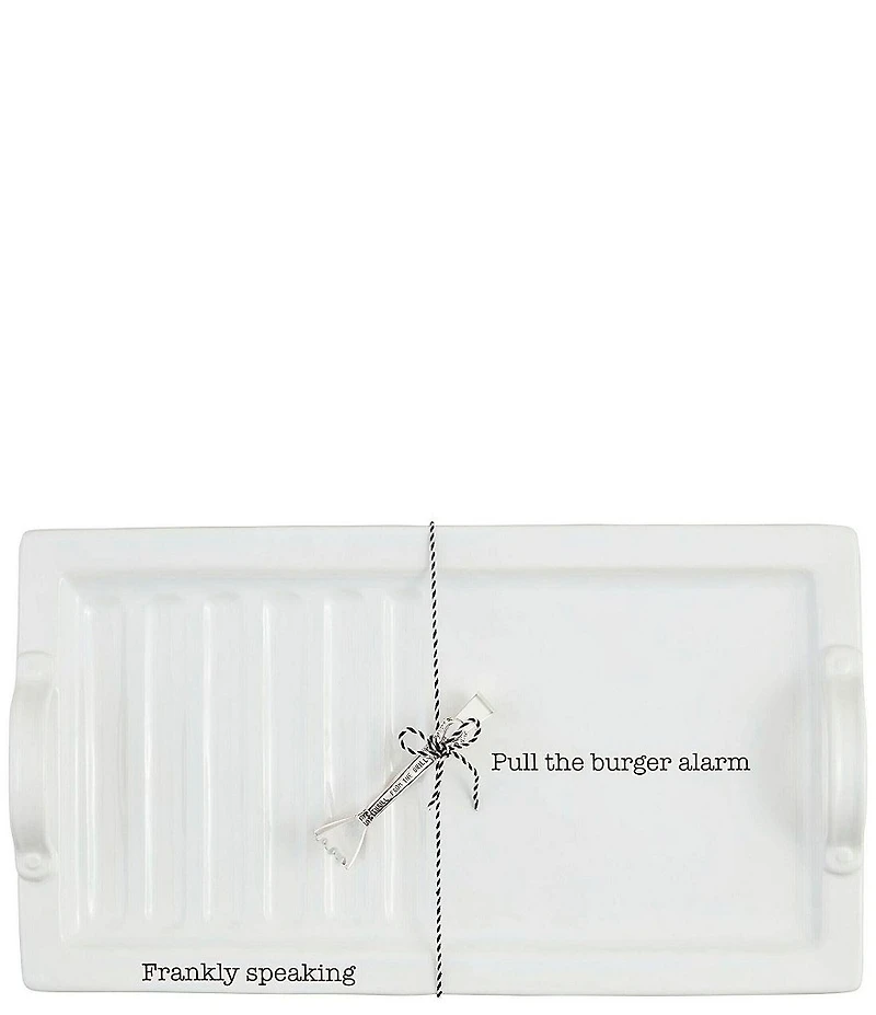 From the Circa Collection by Mud Pie, this platter features: Set include plate and tongs Ceramic Stamped silverplate tongs Platter features grooves to hold hot dogs and flat area to hold burgers. Sentiment wording "Frankly speaking" and "Pull the Burger alarm" Dishwasher and microwave safe Each measures: Platter: 10" x 18" Tongs: 4.5" Imported.