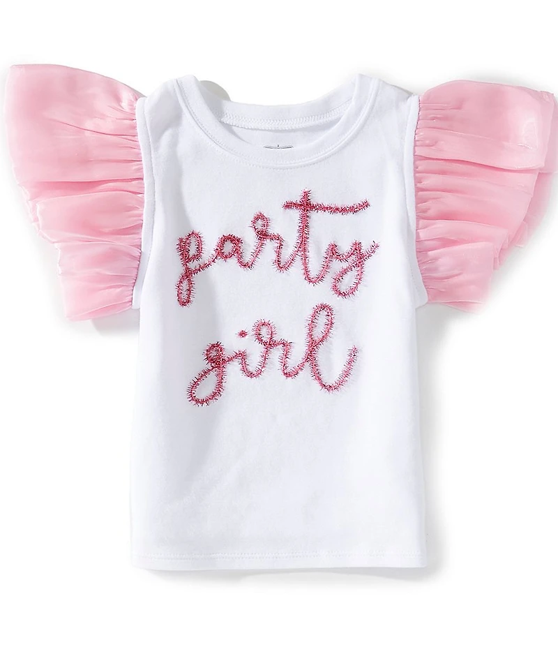 From Mud Pie, this T-shirt features: Round neck Shimmer flutter short sleeves Graphic screen print on the front Straight hem Pullover styling Machine wash/tumble dry Imported