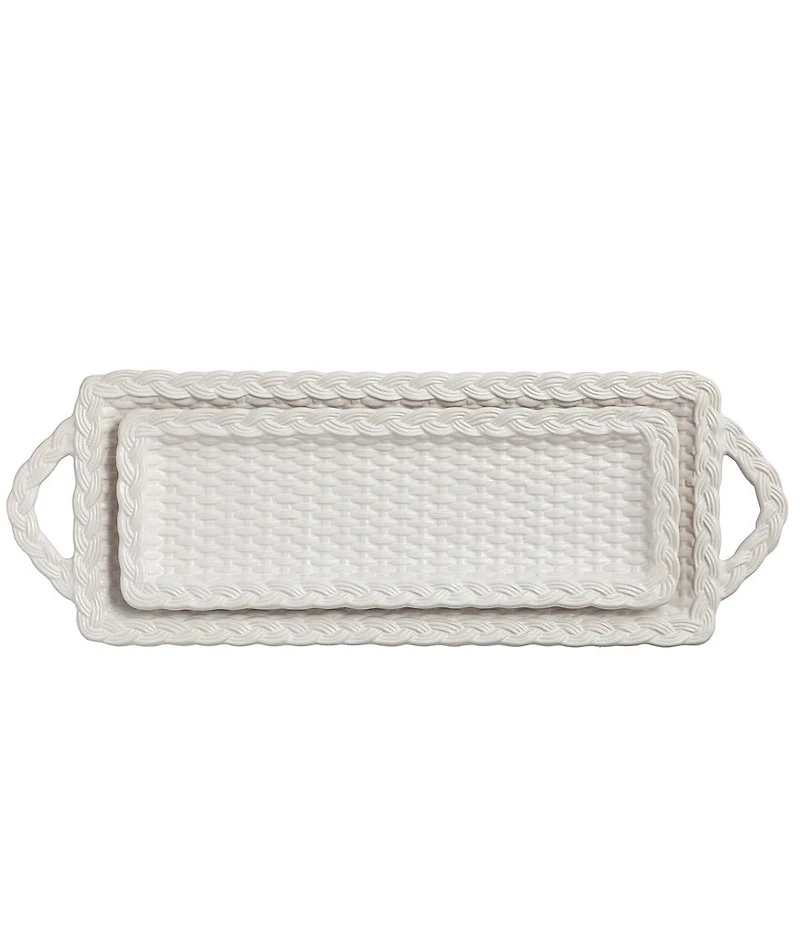 From Mud Pie, this tray set features: Nested set of two glazed stoneware trays with woven wicker surfaces and braided rope textured edges. Ideal for serving appetizers, displaying decorative items, or organizing essentials, these versatile trays are a stylish addition to any room. Set of two nested trays Stoneware Glazed Woven wicker surfaces Braided rope texture Perfect for serving appetizers or displaying decorative items Dishwasher and microwave safe Each Approx. Approx. Small 4.5" x 12.5" Approx. Large 6.25" x 17.5" Imported