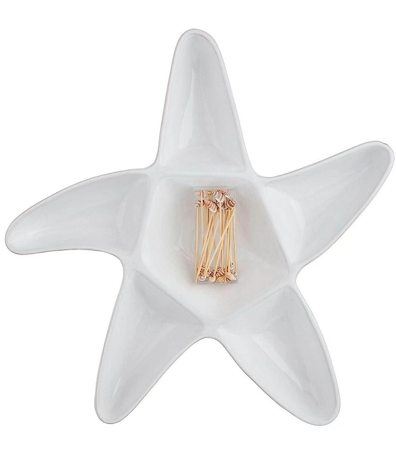 From Mud Pie, this server and toothpick holder features: This exquisite 2-piece set features a beautifully crafted milk glazed terracotta starfish server,designed with five distinct sections to elegantly present a variety of appetizers, snacks, or condiments. Set includes server and toothpick set Milk glazed terracotta Starfish shaped server Five-sectioned starfish design Includes shell topped wooden toothpicks Dishwasher and microwave safe Approx. 14.5" x 14" Imported.