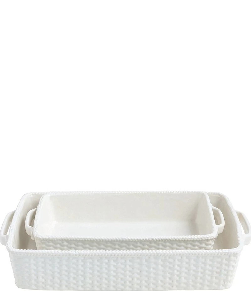 From Mud Pie, this rectangular tray features: Set of two glazed stoneware bakers with woven texture exteriors. Set includes 2 trays Stoneware Woven texture Dishwasher and microwave safe Each Measures Approx. Small 6.5" x 10.5" Approx. Large 8.5" x 12.5" Imported