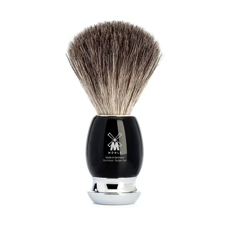 Vivo Black Resin Pure Badger Shaving Bru. Features: Resin handle in black. Chrome-plated highlights. Polished durable finish. Classic rounded design. Includes: Pure badger brush head. Ring size M: 21 mm. Black resin handle. Chrome accents. Benefits: Stronger massage effect. Soft flexible bristles. Durable resin quality. Classic MHLE styling.