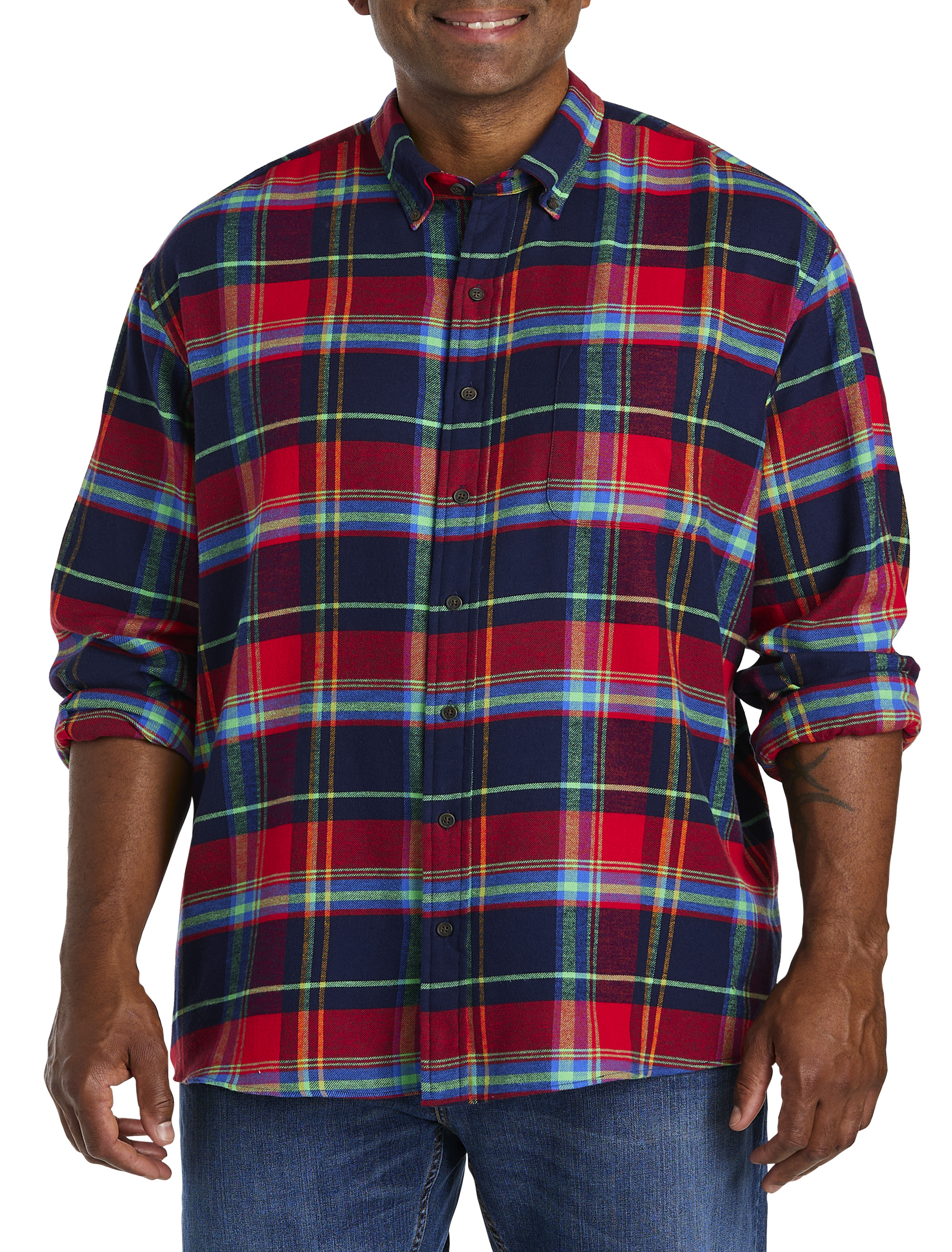 A great flannel shirt is a cool-weather classic. Available exclusively at DXL in Big and Tall sizes, this one is crafted in 100% cotton to be incredibly comfortable, yet structured enough to go just about anywhere. The iconic, bright plaid pattern makes it a casual favorite that easily pairs with jeans or twills for a complete look. Wear it on its own or layer it over one of our many great-fitting T-shirts.