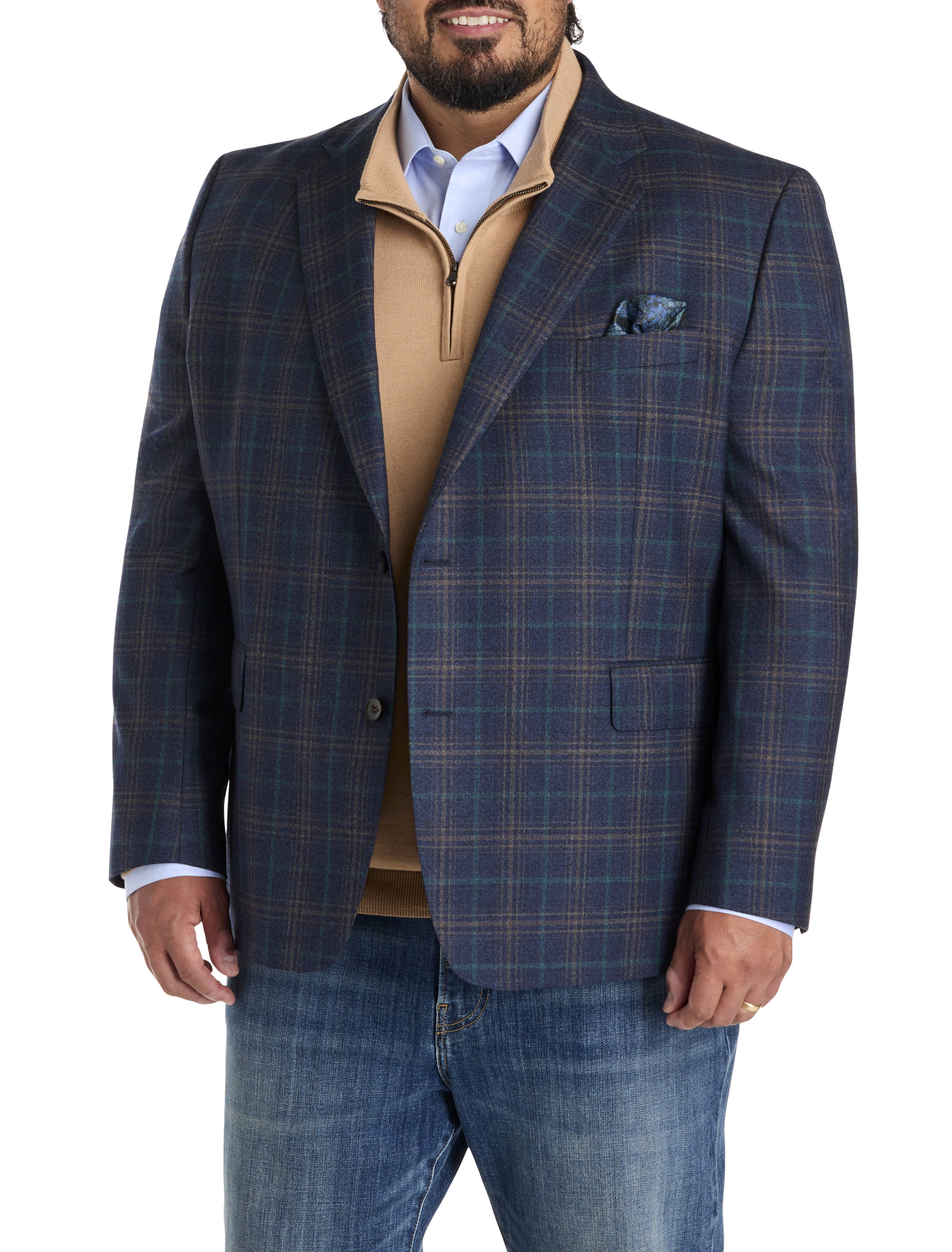 Who says sport coats can't have a little fun? Break free from the traditional with this eye-catching plaid style. Designed with the renowned DXL Big and Tall Fit specifications which ensure precise proportions and an impeccable fit for Big and Tall guys, this Tallia sport coat is a must have for your wardrobe. It's comfortable, easy-to-wear and gives you the freedom to move without restriction. Pair it with a pullover and jeans for a smart, casual look or with a button-down and dress pants for the office - it's that versatile.