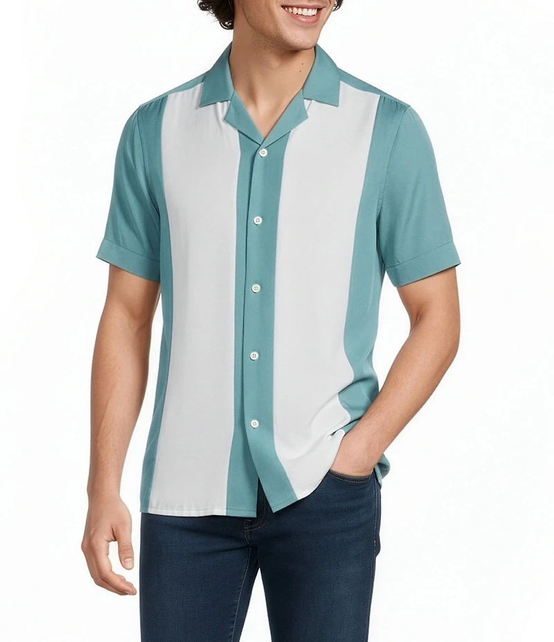 From Murano's Palm Springs Collection, this shirt features: Bold, stripe pattern Slim fit Camp collar Short sleeves Button-front closure Lyocell Machine wash/tumble dry Imported.