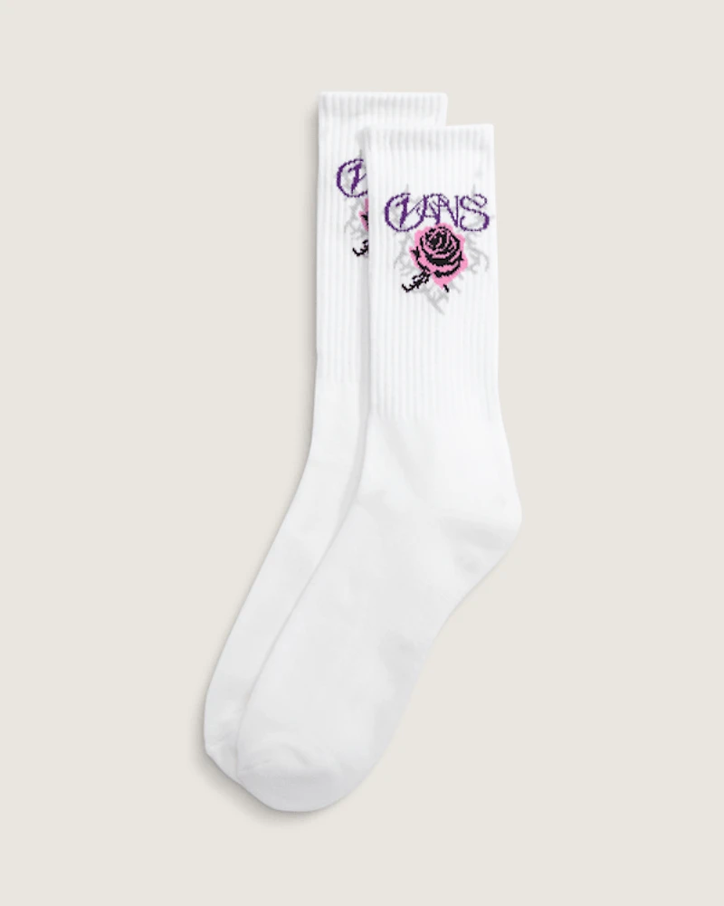 Crew socks combine cushioned comfort with stylish Vans branding. The jacquard Vans logo with a rose design adds a touch of floral flair, while the cushioned sole provides all-day support. Made from a soft cotton blend, these socks are perfect for casual everyday wear.