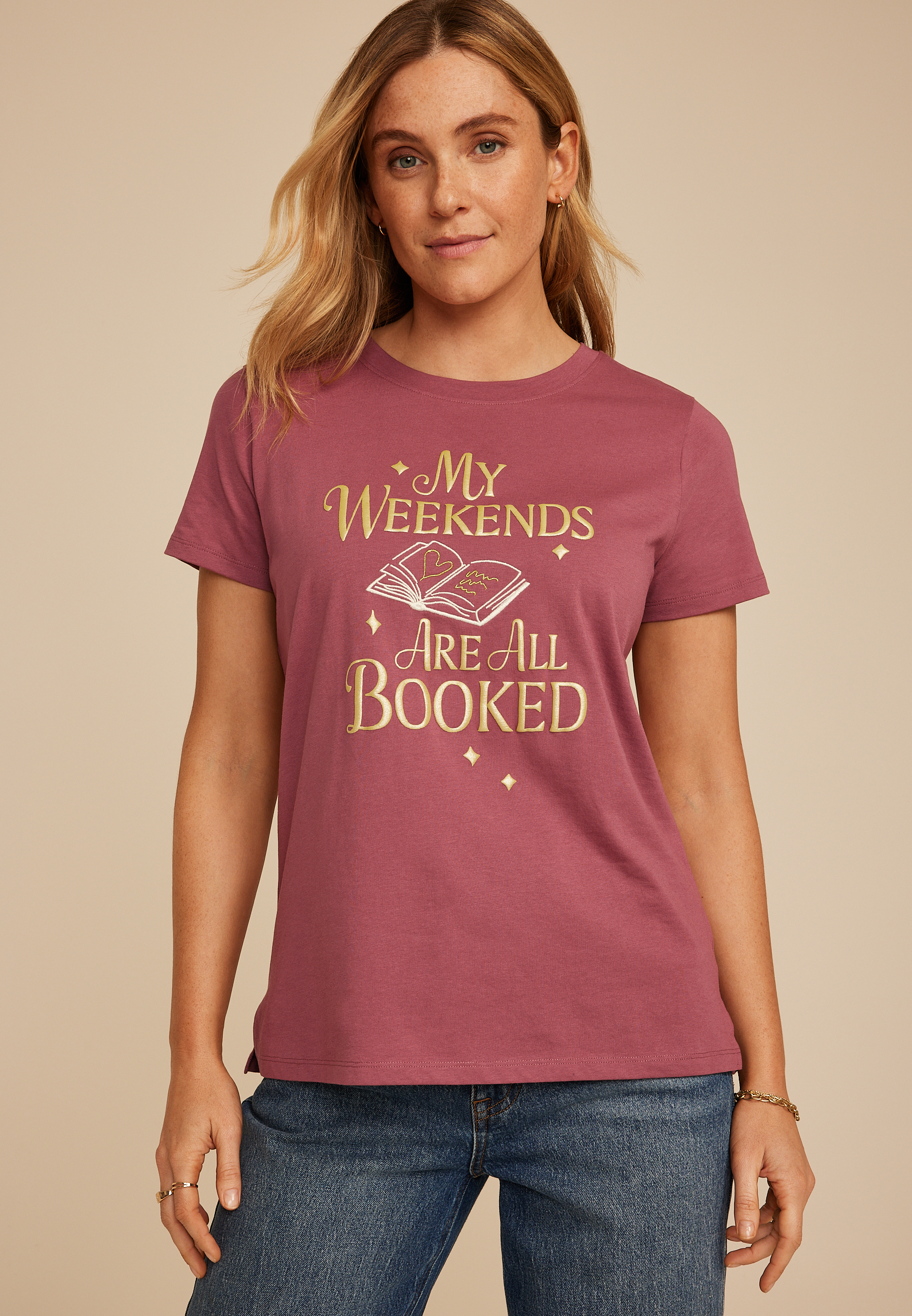 • “my weekends are all booked” gold sheen lettering accents and stacked books graphic