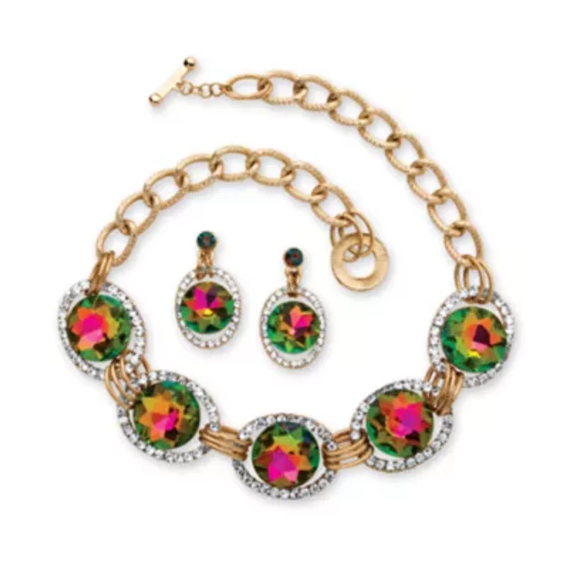 You'll turn heads when you walk down the street in this 2 piece set. Rows of round mystic crystals and halo clear crystals shimmer with each step. Includes 21" bib necklace and drop earrings. Yellow gold tone.Main Stone: 5 Round Faceted Cut Mystic Fire Crystals, 25 mm x 25 mmAccent Stone: 190 CrystalsGoldtoneNecklace: 32 mm wide x 21 inches long x 12 mm high; Earrings: 8 mm wide x 45 mm long x 8 mm highIncludes gift box and drawstring pouchGoldtoneNecklace Dimensions: 32 mm wide x 21 inches long x 12 mm high, Earrings Dimensions: 8 mm wide x 45 mm long x 8 mm highIncludes gift box and drawstring pouch 3 Toggle closure, 195 Polished finish Warranty available China Imported Product Specifications 1.73 in x 21 in x 1.26 in, 21" length Material & Care Gold-Tone Metal, Gold-Tone Clean with a soft cloth.