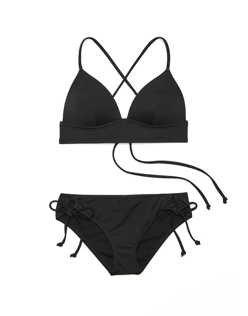 The Nadzia bikini set comes with a black, lightly padded triangle top and your choice between two styles of matching bottoms. This versatile two-piece is perfect for a day of sun and sand. (Available in sizes XS-XL.)