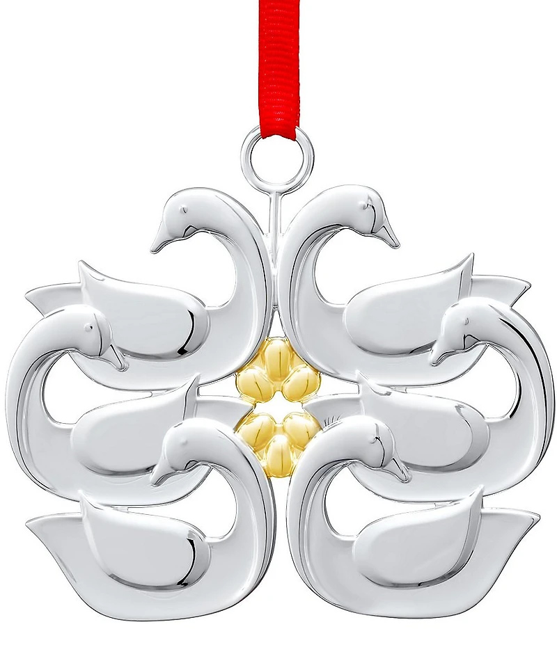 On the sixth day of Christmas, share a symbol of new life and creation. Part of the Twelve Days of Christmas Ornament series, the ornament depicts six silver geese with their eggs all in gold. Silver and gold plated Holiday Collection Red grosgrain ribbon for hanging Wipe clean with dry cloth Measurements: 4” L x 2.5” H Introduced: 2022 Imported