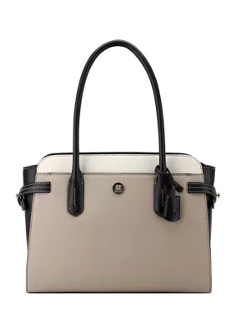 Spacious and sleek, this shoulder bag from Nine West is elevated by gold hardware and a color-blocked design. Zip closure Shoulder strap Imported Material & Care Polyurethane Wipe clean