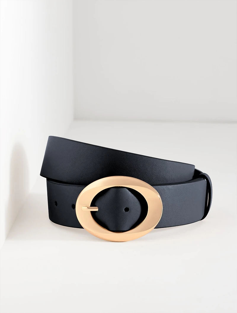 A sculptural buckle shines bold and bright on this nappa leather belt. A luxe finishing touch. Versatile and polished.