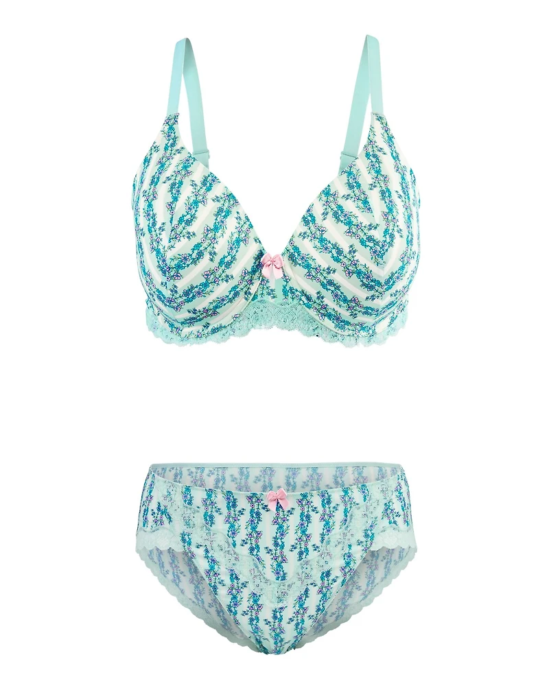 The Nare Floral Blue 9 Plus is a classic and comfortable full-coverage contour bra with smooth molded cups, pretty lace trim, and a matching hipster or thong panty. (Available in plus-sizes 38DD-46DDD.)