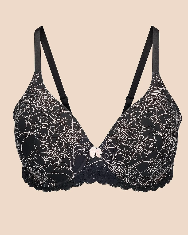 This smooth t-shirt bra comes in a fun spiderweb print and is perfect for everyday wear. It features smooth molded cups, a lace-trimmed bottom band, fully adjustable straps, and double hook-and-eye closure. (Available in sizes 38DD-46DDD.)