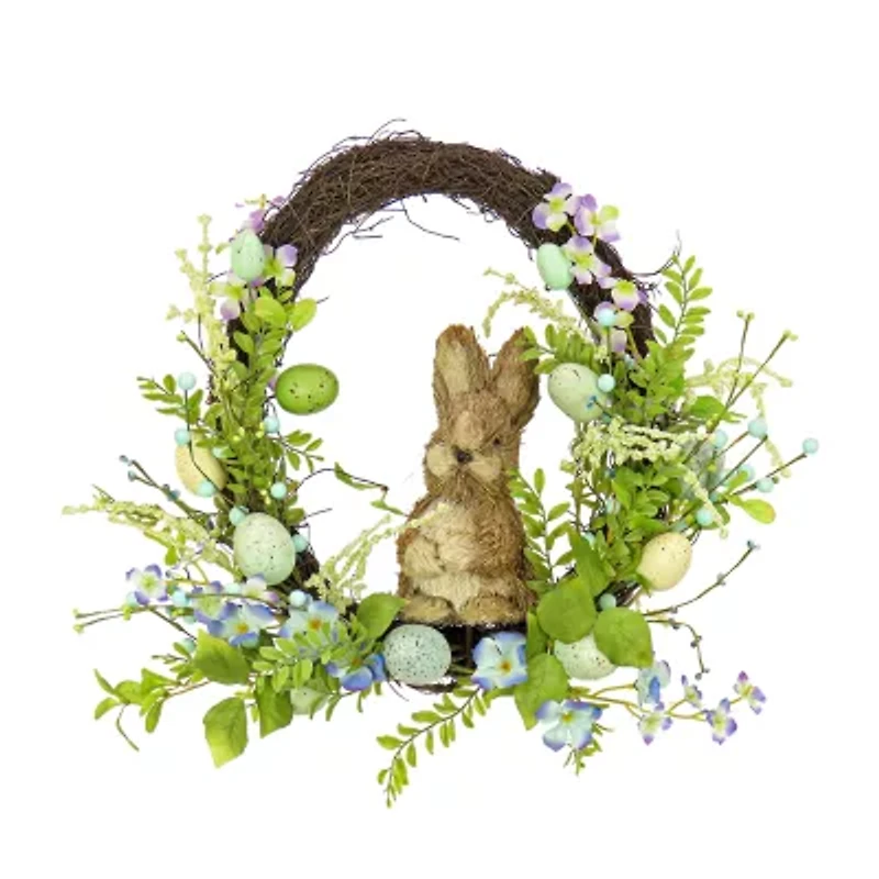 Capture the essence of the Easter season with National Tree Company's Artificial Spring Wreath. This artificial Easter wreath measures 16 inches in diameter, is designed with a sturdy, woven branch base and features a wooden bunny rests at the base. This artificial hanging wreath is decorated with an assortment of blue flower blooms, colorful pastel eggs and features a swirl of long, leafy greens to create an additional natural appeal. Place this artificial hanging decoration on a door, entryway, or covered porch to add a natural flair to any Easter-themed decorative arrangement. Handcrafted with sturdy and durable materials, this decoration is designed to bring Easter cheer for years to come. At National Tree Company, we believe that special holiday memories do not have to be far and few between; this Easter, let our decorations transform your home while you focus on creating more of those magical moments.