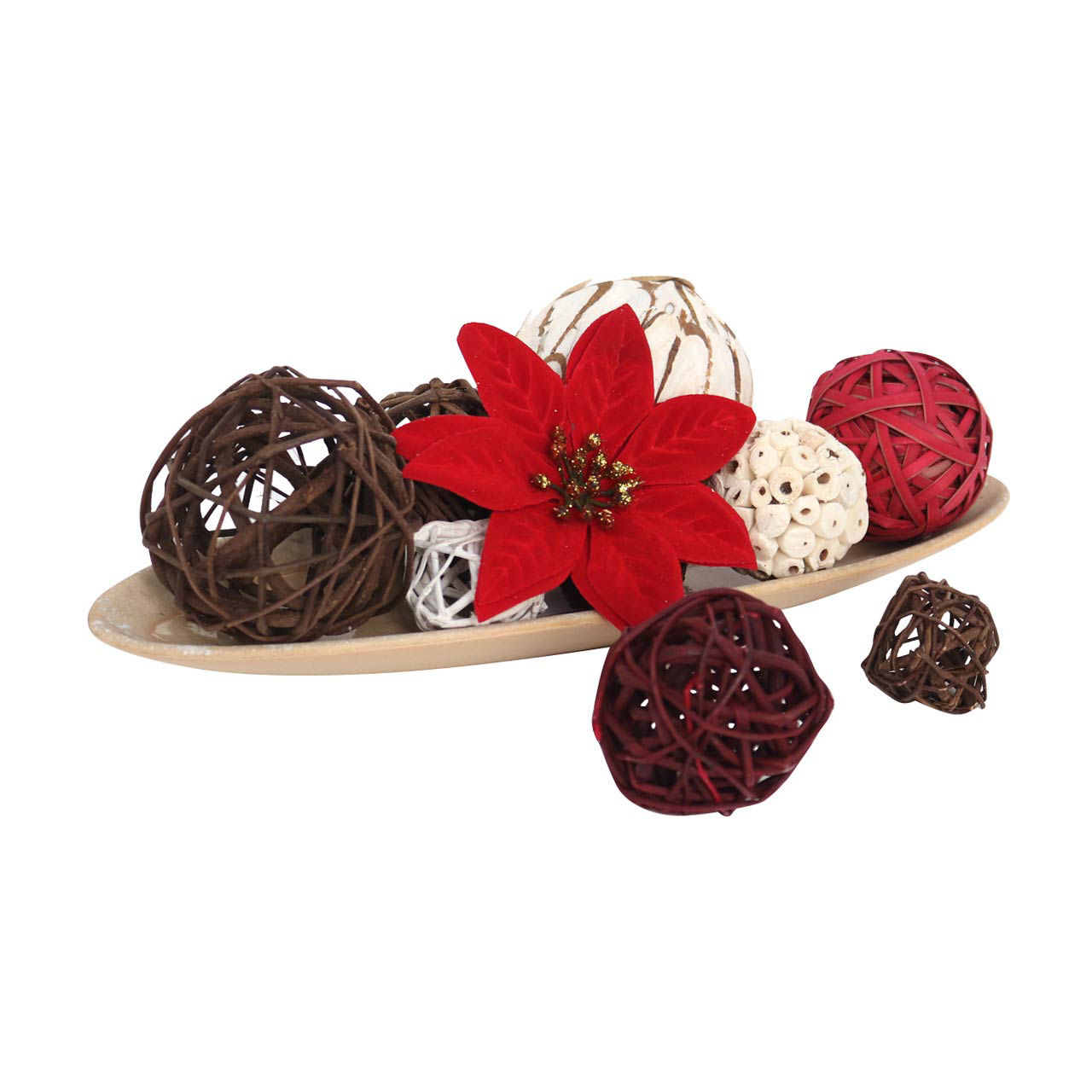 - Assorted set includes woven balls, textured spheres, and a red poinsettia flower