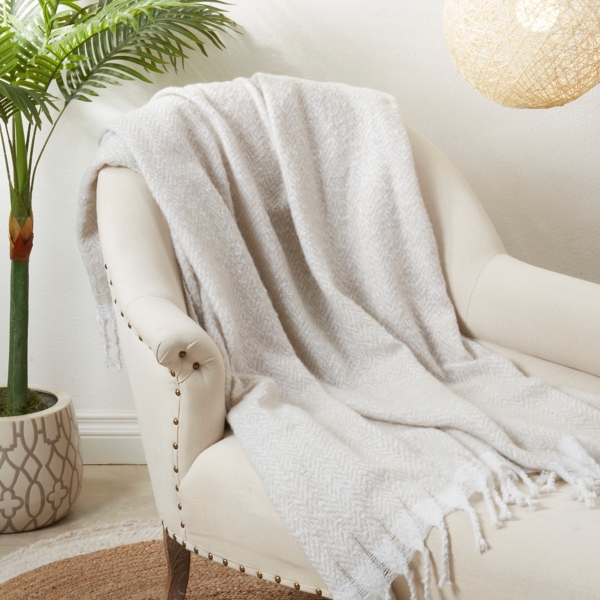 Relax in style and comfort with this Natural Herringbone Faux Mohair Throw! You'll love the sophisticated design and soft feel. It's perfect for helping you unwind at the end of the day! Throw measures 50L x 60W in. Crafted of polyester Herringbone fabric design Fringe edges Hues of natural and white Care: Machine wash cold, hang dry. This item is available at Kirklands.com only, not available in stores. Please note: this item cannot be shipped to APO/FPO addresses.