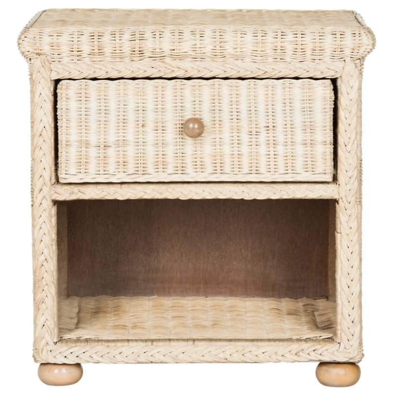 Inspired by the quaint, designer furnishings of the coast of South Carolina, this Natural Rattan Coastal Accent Table boasts beauty and function. Its wicker style will bring natural texture and casual elegance to your space! Overall dimensions Width: 22.1 in. Depth: 16.5 in. Height: 22.1 in. Crafted of wood and rattan Natural tan finish Features one (1) drawer and one (1) shelf Woven wicker design Weight capacity: 35 lbs. No assembly required Not intended for commercial use Care: Dust with a soft, dry cloth. This item is available at Kirklands.com only, not available in stores. Please note: this item cannot be shipped to APO/FPO addresses.