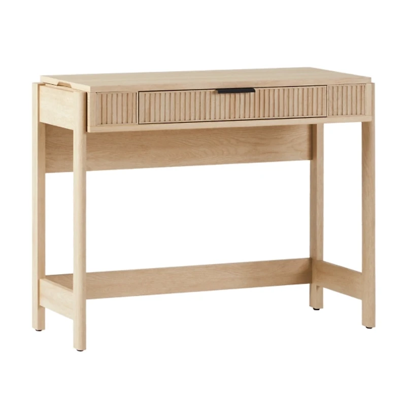 This Natural Reeded Wood Lift-Top Desk gives you the flexibility to work when and where you please! You can work sitting, standing, or simply use it to store your favorite books and trinkets. Desk measures 38W x 16.75D x 30H in. Crafted of warp-resistant MDF and laminate Natural finish Features a lift-top design for standing Accented with reeded drawer front Weight: 66 lbs. Weight capacity: 100 lbs. Quick assembly required Not intended for commercial use Care: Dust with a soft, dry cloth. This item is available at Kirklands.com only, not available in stores. Please note: this item cannot be shipped to APO/FPO addresses.