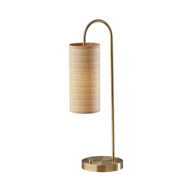The Natural Woven Shade Malina Table Lamp will light up your home with a sense of coastal sophistication. The polished brass finish provides a beautiful contrast to the natural woven shade. Overall lamp measures 25H in. Crafted of metal and natural woven paper Brass finish Arched arm Hardback cylinder shade in natural woven paper Shade measures 11H x 5 in. in diameter Socket accommodates a 40-watt, incandescent bulb Features a clear, plug-in cord On/Off rotary switch on base Care: Dust with a soft, dry cloth. Do not exceed specified wattage. This item is available at Kirklands.com only, not available in stores. Please note: this item cannot be shipped to APO/FPO addresses.