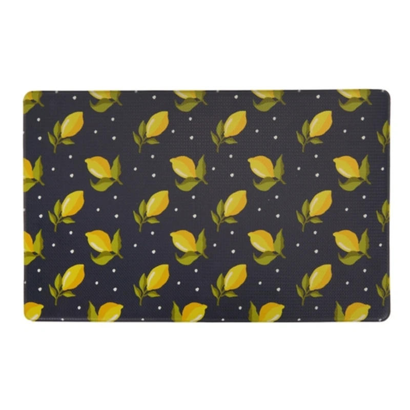 Make cooking and cleaning feel comfortable underfoot with our Navy Lemon Kitchen Mat. The bright lemons and cute polka dots will add the perfect pop of pattern to your kitchen! Mat measures 39L x 20W in. Crafted of 100% PVC Lemon pattern Polka dot accents Hues of navy, yellow, green, and white Care: Wipe clean with a soft, dry cloth. Contact your local Kirkland's store for availability. Quantities and selection may vary by location.