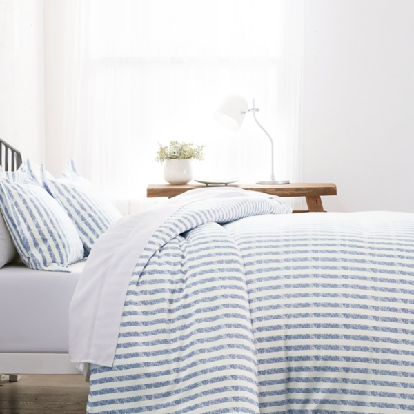 Give your bedroom a contemporary, coastal look with our super cozy Navy Rugged Stripes Puffed Queen 3-pc. Duvet Set! You'll love its timeless design and comfortable construction. Set includes one (1) duvet and two (2) pillow shams Duvet measures 96W x 96L in. Each sham measures 30L x 20H in. Crafted of microfiber Stripe pattern Hues of blue and white Includes zipper closure to protect your comforter Wrinkle-free fabric Made of ultra-plush and soft 90 GSM microfiber Care: Machine washable. This item is available at Kirklands.com only, not available in stores. Please note: this item cannot be shipped to APO/FPO addresses.