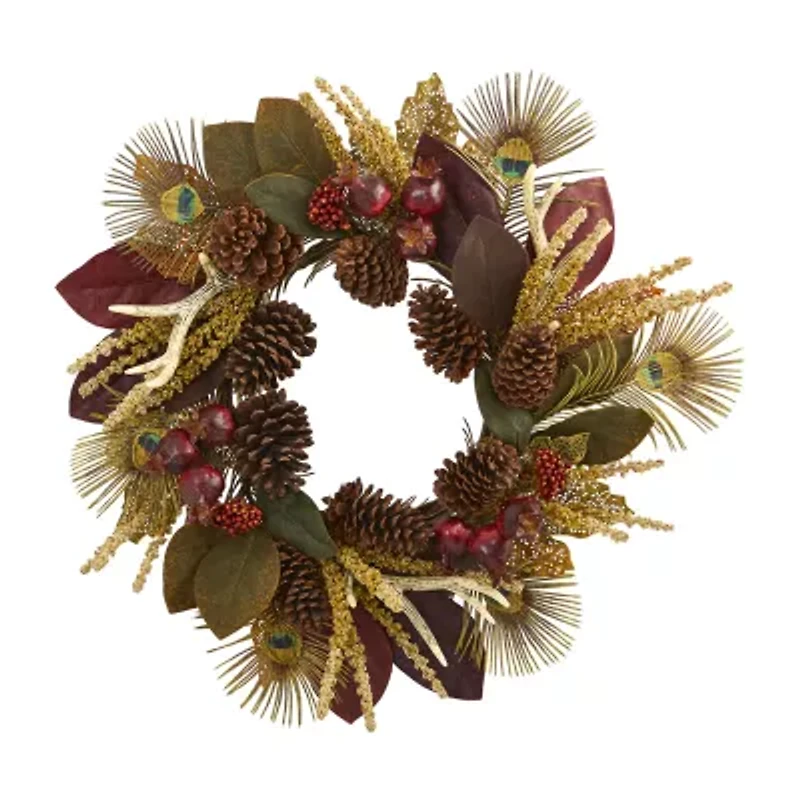 Nearly Natural 27in. Magnolia Leaf; Berry; Antler And Peacock Feather Wreath