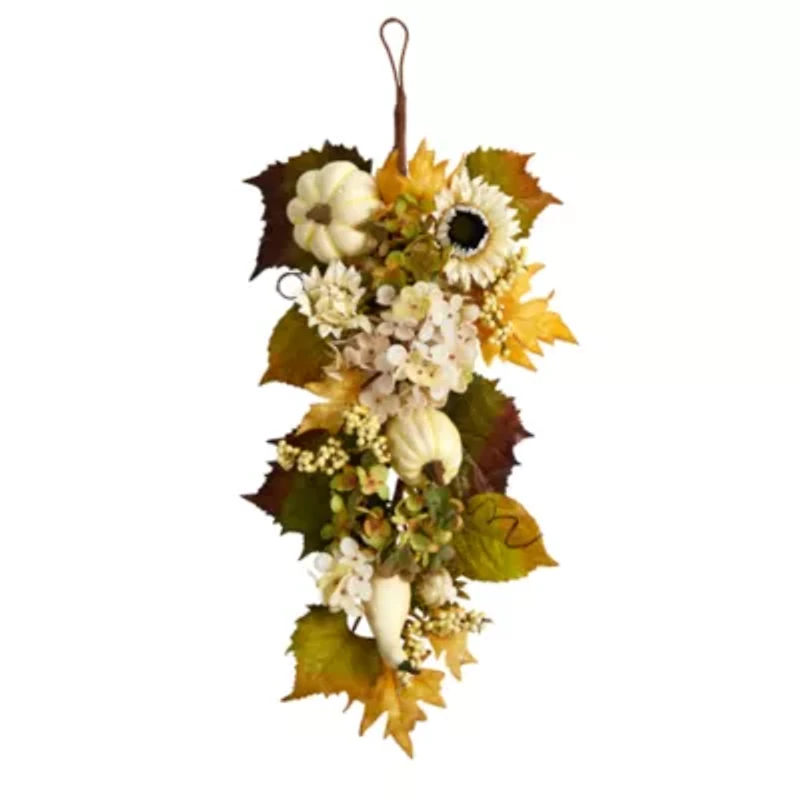 Capture the beauty of fall with this Autumn Sunflower and Pumpkin Artificial Teardrop. Variegated sunflowers and hydrangeas adorn a green silhouette of leaves, accented by a palette of fall-foliage inspired leaves. To soften the look and bring a rustic, intimate touch, pumpkins bring an exciting draw to the eye and color. With dimensions of 33in., curate this teardrop in a bare wall or door. Perfect for the Harvest season and Thanksgiving . Artificial swags are manufactured using synthetic materials, such as polyester material or plastic, and are well designed and constructed to be life-like in appearance. This item will need to be re-shaped when removed from the secure box to allow it to reach its fullest size. Your artificial plant will look beautiful for years to come; simply wipe clean with a soft dry cloth when needed.
