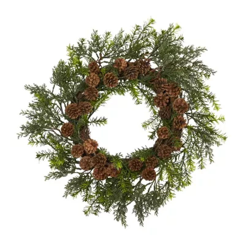 Update your seasonal decor starting at the front door with the help of this artificial wreath. Handsomely designed from a mix of realistic looking cedar and grass foliage, it's accented throughout with a collection of incredibly lifelike pinecones, all of which is specifically designed with uv resistance to allow you the ability to showcase either indoors or outside without the fear of it suffering damage from the natural elements. A great decorative accent for the colder months of the year, it measures 22" in circumference. Silk plants are manufactured using synthetic materials, such as polyester material or plastic, and are well designed and constructed to be life-like in appearance. This item will need to be re-shaped when removed from the secure box to allow it to reach its fullest size. Your artificial plant will look beautiful for years to come; simply wipe clean with a soft dry cloth when needed.
