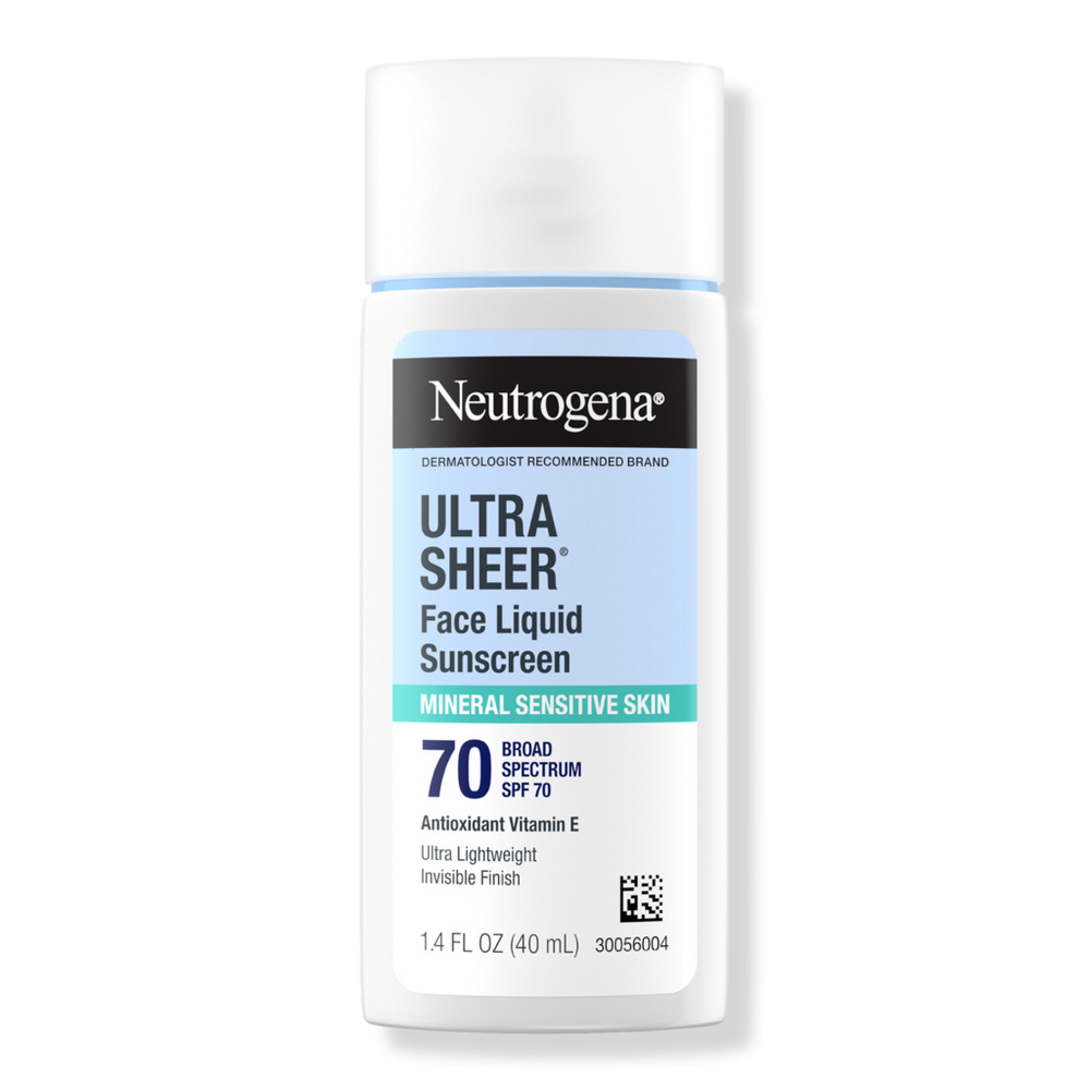 ULTRA SHEER MINERAL FACE LIQUID SPF 70. Benefits: With broad spectrum SPF 70 sun protection that provides an invisible finish and all-day hydration. Sunscreen formulated with titanium dioxide and zinc oxide to protect skin and prevent sun damage. Non-comedogenic mineral sunscreen that won't clog your pores and works well under makeup. Neutrogena Ultra sheer Face Liquid SPF 70 Mineral Sunscreen with Vitamin E ideal for sensitive skin. Formulated Without: Fragrance. Oxybenzone. Parabens. Phthalates. :