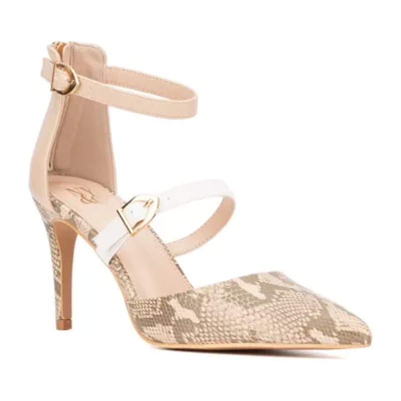 The Jaelynn pointed toe flaunts a beautiful ankle strap, back zip closure and stiletto heel. This trend-forward pair sharpens up a fave look with ease.