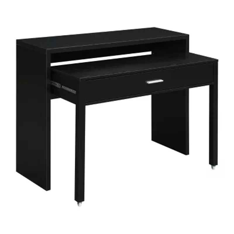 Slide on into your office with the Newport JB console/sliding desk with drawer and riser by convenience concepts. This modern-style desk expands into two sections giving you the space needed to complete your work. The middle shelf offers double the workspace by easily sliding out thanks to the smooth ball-bearing slides and caster wheels. The top riser is perfect for a monitor or lamp while the second tier is great to store the keyboard, mouse, or laptop. The wide drawer, on ball-bearing slides, also offers additional storage for unsightly office supplies. When not in use, turn this desk into a console table by conveniently sliding the second tier under the top shelf for a clean compact look. Crafted from honeycomb and particleboard materials, this durable desk is sure to last. Add coordinating pieces from the Newport collection from convenience concepts, each sold separately.