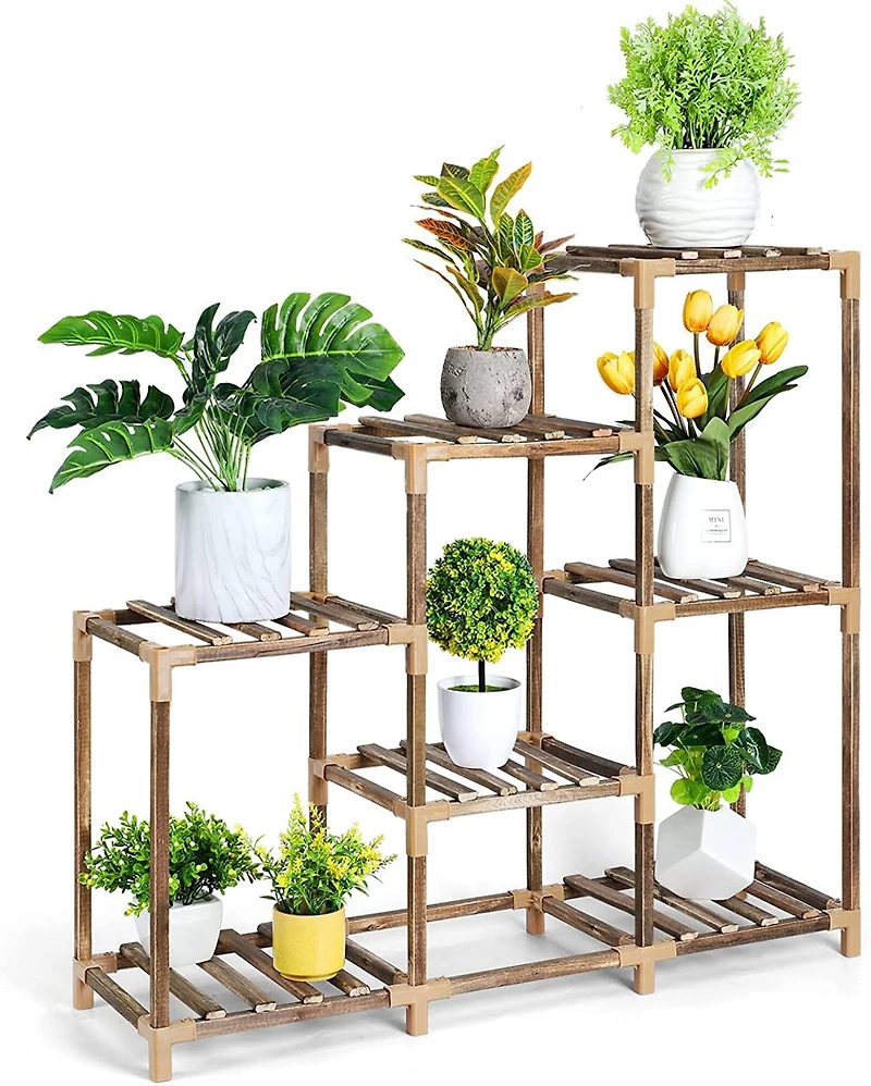 Made of natural eucalyptus wood and carbonized at high temperature, our plant stand is more durable, heat-resistant and moisture-proof. Clever use of the rectangular structure and the triangular joint structure to make the plant shelf itself more stable with no wobble. Suitable for places in your bedroom, living room, corridor, sofa corner, hallway, garden and patios. Turns your boring small space into a vibrant and elegant scenery.Details:Brown11.2" x 31.1" x 32.6"5 lb.Wood