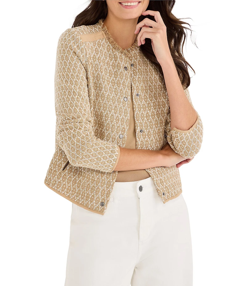 NIC + ZOE Brocade Fringe Knit Round Neck Long Sleeve Jacket