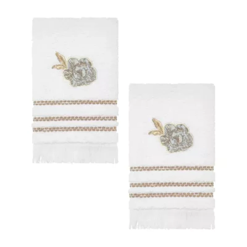 The Nicole Miller Camille 2-Pack Decorative Embellished Fingertip Towel Set features an appliqued periwinkle flower with beige and white embroidered details. The 100% ring spun cotton white terry towels are accented with 3 coordinating beige polyester stripes and finished with a brush fringe. Set includes two (2) 11" x 18" towels. Coordinating shower curtains, rug and bath accessories also available. Shop the entire Nicole Miller Bath Collection of shower curtains, towels, rugs and bath accessories.