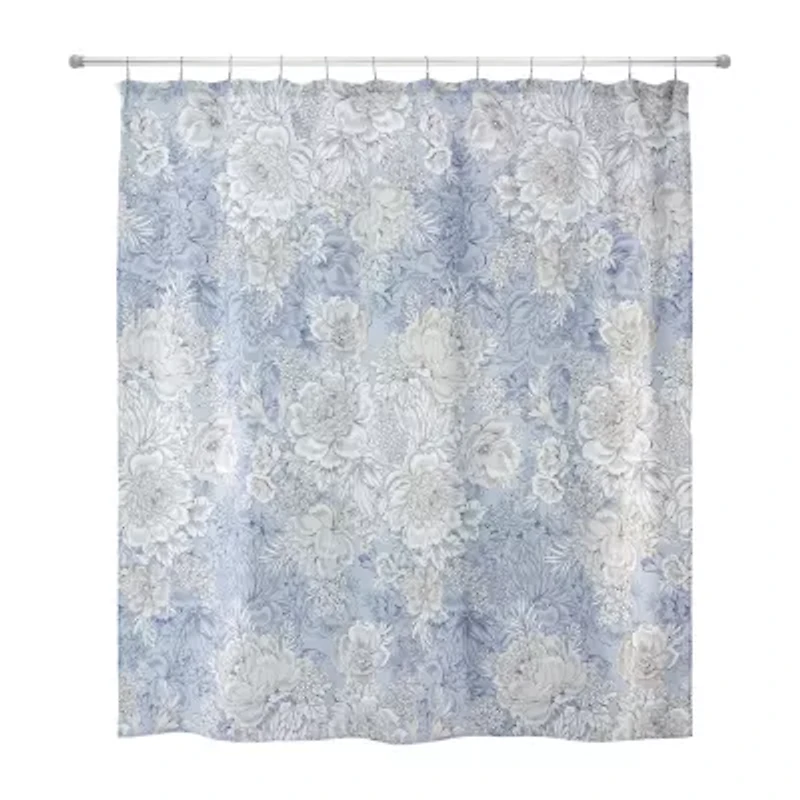 The Nicole Miller Camille Decorative Shower Curtain features a large-scale floral print with beige and brown flowers popping from a periwinkle blue base. Beautifully printed on a textured 100% polyester cloth for easy care and brilliant colors. Measures 72" x 72". Coordinating towels, rugs and bath accessories are available. Shop the entire Nicole Miller Bath Collection of shower curtains, towels, rugs and bath accessories.