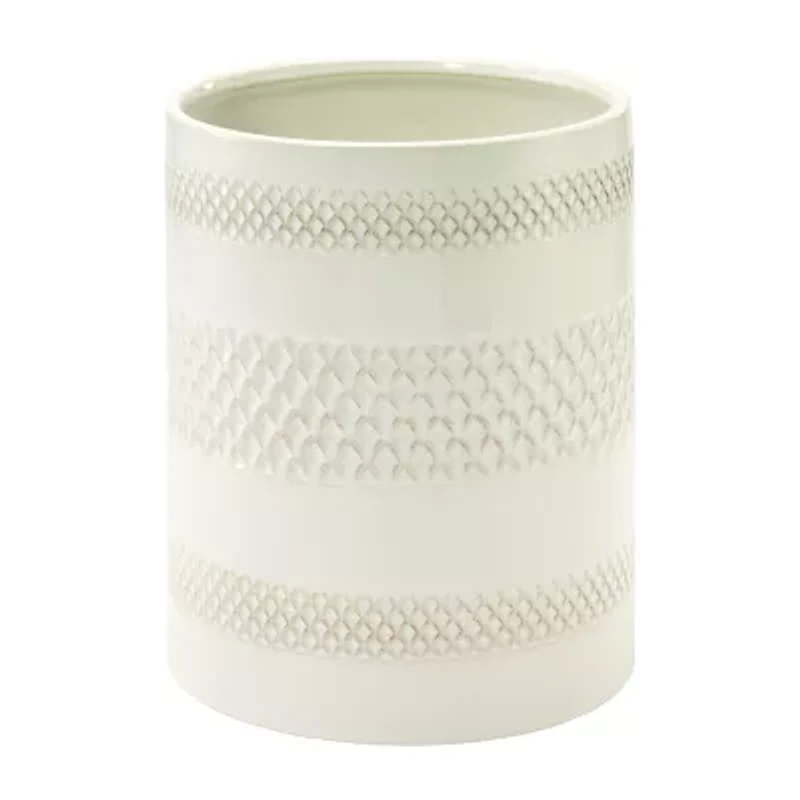 The Nicole Miller Lyra Wastebasket features a glossy solid cream ceramic base with one wide and two narrow embossed trellis bands. The trellis is highlighted with a hand-applied light brown reactive glaze-each piece is unique. Made of durable ceramic for easy care. A great addition to any bathroom, bedroom, kitchen or office. Measures W 8" x L 8" X H 10". Other matching bath accessories are available. Shop the entire Nicole Miller bath collection of shower curtains, towels, rugs and bath accessories.