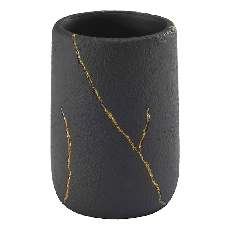 Make your bathroom counter chic with this Nicole Miller Sydney Black Bathroom Tumbler. It's perfect for holding toothbrushes, makeup, and other accessories! Tumbler measures 4H x 3 in. in diameter Crafted of resin Aqua blue finish Marble look with subtle white veins Care: Wipe with a clean, damp cloth.