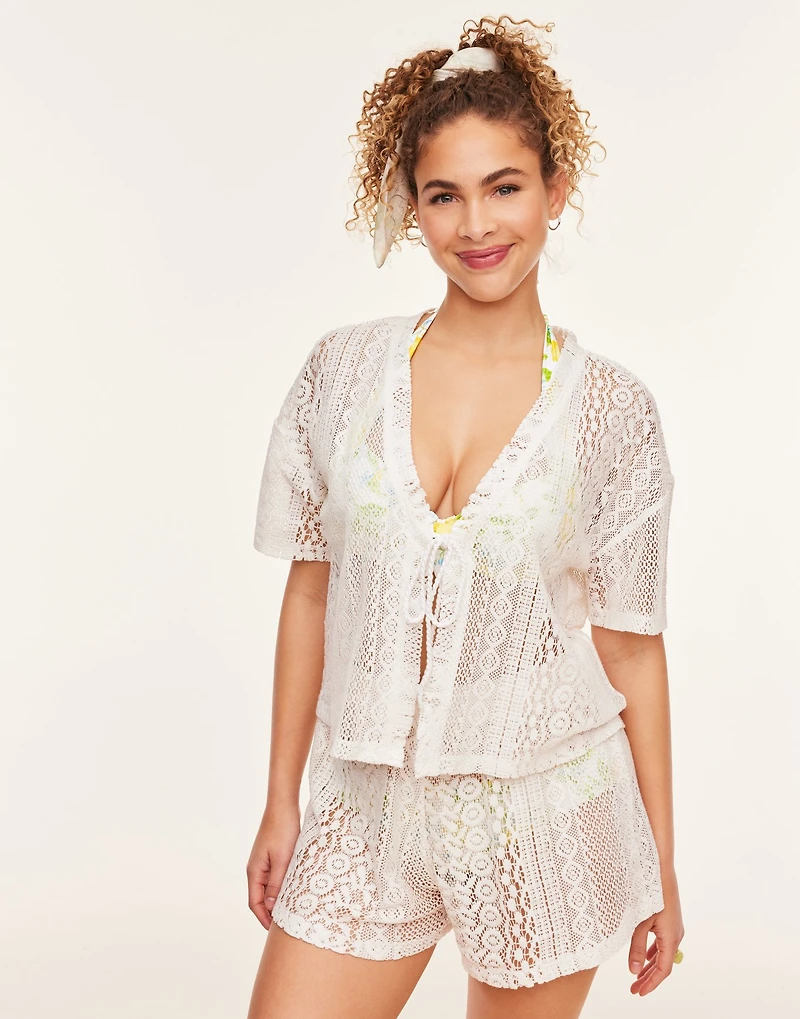 This crochet cover-up set includes a boxy top with short sleeves and a matching set of shorts. The bright white set is perfect for the beach, pool, or layering over your swimsuit. (Available in sizes XS-4X)