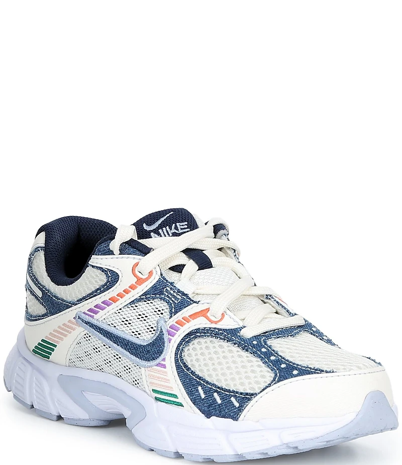 From Nike, the Girls' V5 RNR Running Shoes feature: Mesh upper with synthetic leather overlays is breathable and durable Classic lace-up closure Denim accents throughout add a pop of color and texture Synthetic lining Plush low-cut collar lining and foam midsole provides all-day comfort Rubber outsole with '00s-inspired grooves adds great traction