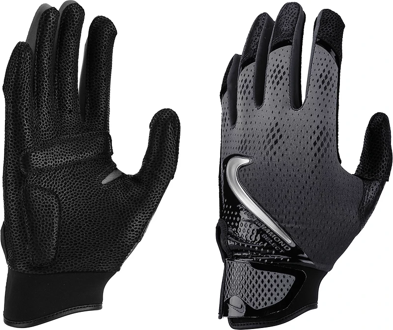 Enjoy full comfort throughout your swing with the Nike Hyperdiamond Select 3.0 Batting Glove. The goat skin leather and neoprene material provides comfort and durability, while the padded palm reduces sting and improve shock absorption for additional comfort.