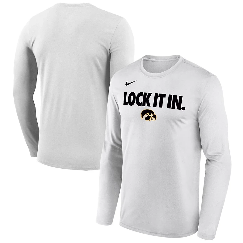 Dribble past the competition in this Iowa Hawkeyes On-Court Bench Long Sleeve T-Shirt from Nike Matching what the players on the bench will wear during the 2026 NCAA Basketball season this tee features a "Lock It In" wordmark across the chest with the Iowa Hawkeyes logo underneath With Dri-FIT technology to wick away sweat and a lightweight breathable build you'll be able to hit the gym or enjoy even the most intense matches while staying cool and comfortable