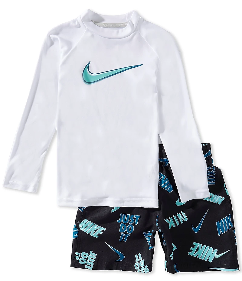 From Nike, this 2-piece set features: Long-sleeve rashguard top with crew neckline and long sleeves plus "Nike" heat-transfer logo on the chest and pullover styling Coordinating swim trunks in a "Nike" logo, "Swoosh" design trademark and "Just Do It" slogan print with pull-on styling and drawstring/elastic waistband plus mesh pocket bags that are designed for water drainage and built-in boxer liner that provides a snug, secure fit to help prevent chafing; 5" inseam T-shirt of polyester; swim trunks of polyester with recycled polyester lining Machine wash/tumble dry Imported.